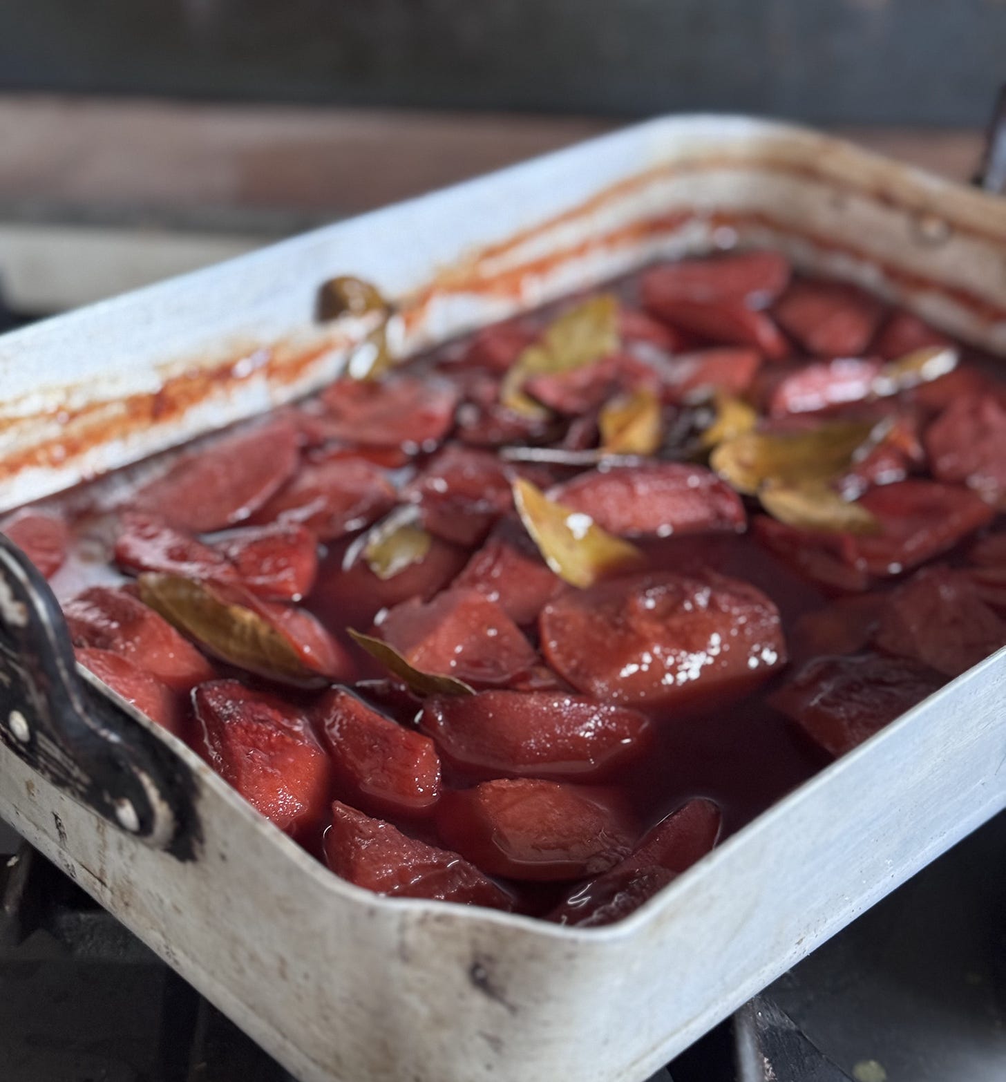 Place the quartered quinces in a heavy baking pan, add the sugar and herbs and spices. Measure out the water, saved from the cores and peels and top up with more water to make a total of 750mls making sure that the quinces are mostly covered with liquid. Cover the pan with either a sheet pan or aluminium foil. Place in a 120 degree oven overnight, if possible, or if your oven is less reliable, or you simply can’t take the stress of leaving it for that long, for a minimum of 6-8 hours. The quinces are ready when they are a lovely rich ruby colour and are soft to the touch (see above). Leave to cool. Eat with ice cream, clotted cream, pop on top of a pavlova, chop up finely and have with some cheese or eat with a game meat of choice!